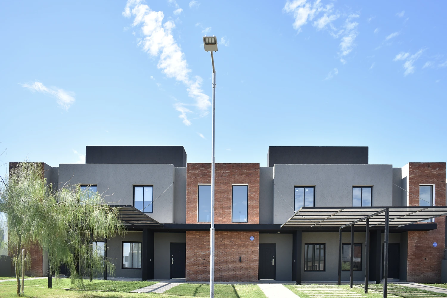 El diseño prioriza la iluminación natural, la funcionalidad de los espacios y la integración con el entorno, incorporando cocheras semicubiertas mediante estructuras metálicas livianas y áreas verdes que acompañan el acceso a cada vivienda. El resultado es un conjunto residencial que combina diseño contemporáneo, calidad constructiva y confort habitacional